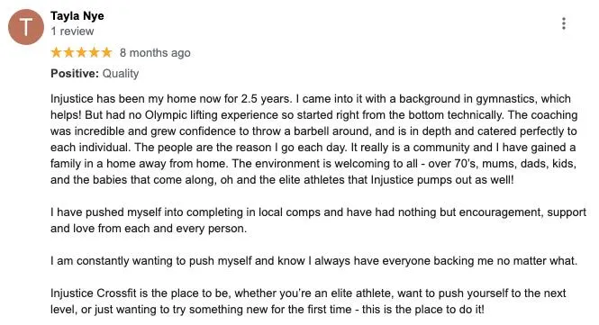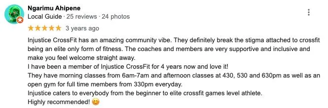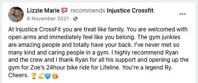 "Ryan (the owner) is super friendly and said to join in on a few classes as the first week is free to try it out. So I went in with very little experience and immediately the coaches adjusted whatever movement we were doing to suit my level. Thanks to Ryan and Em so far for all your support and pretty much everyone else in the gym. Seriously if you are thinking of making a change in your life come and join the crew!"
